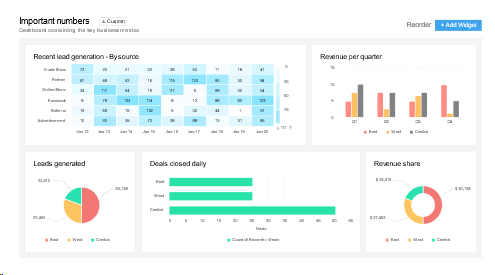 There is a wide range of functionality offered by CRM software, including the tracking of new leads, the source of these leads, the number of contracts won and lost, revenue growth, etc. To better understand, below is an example of a CRM dashboard: